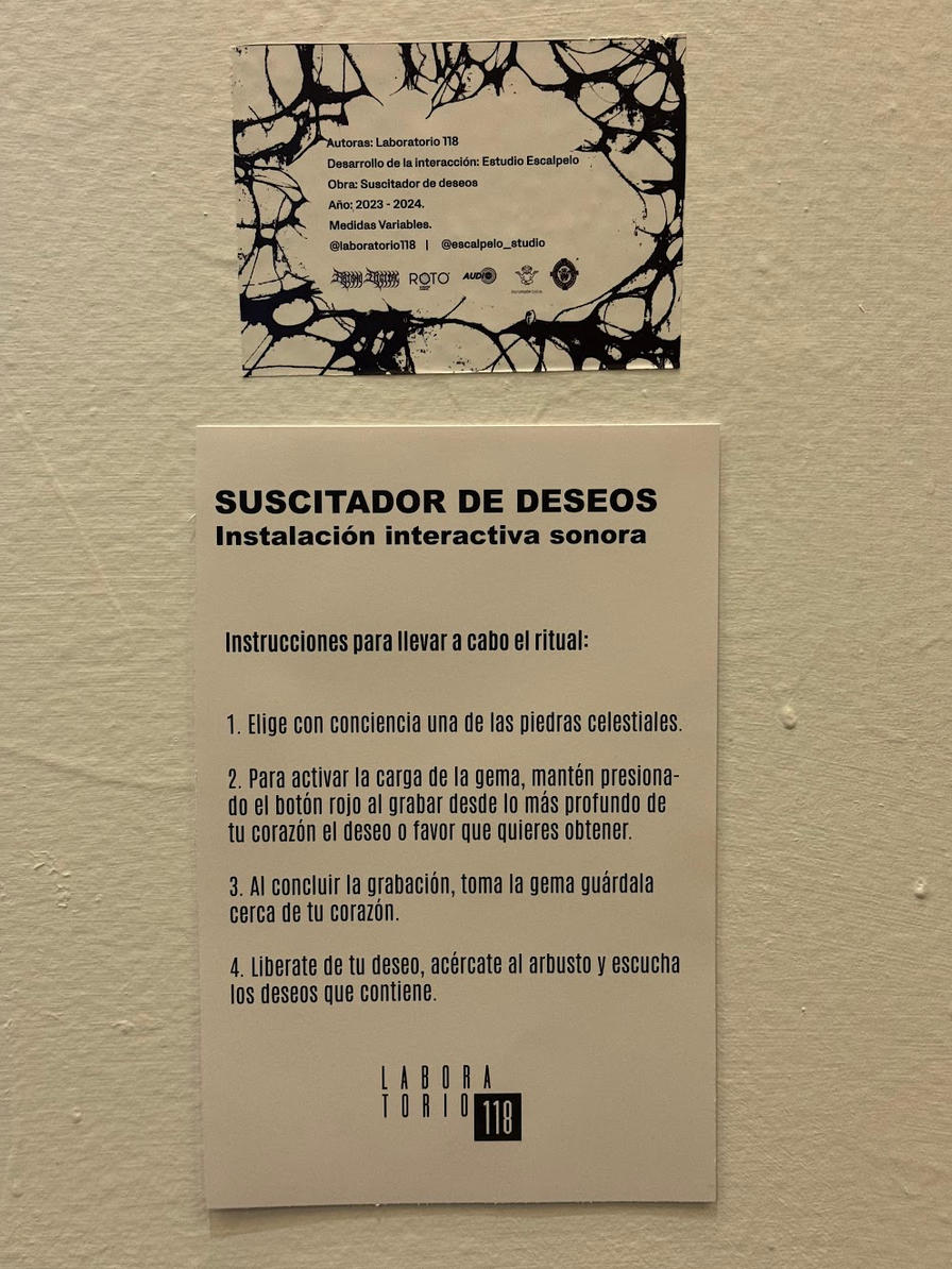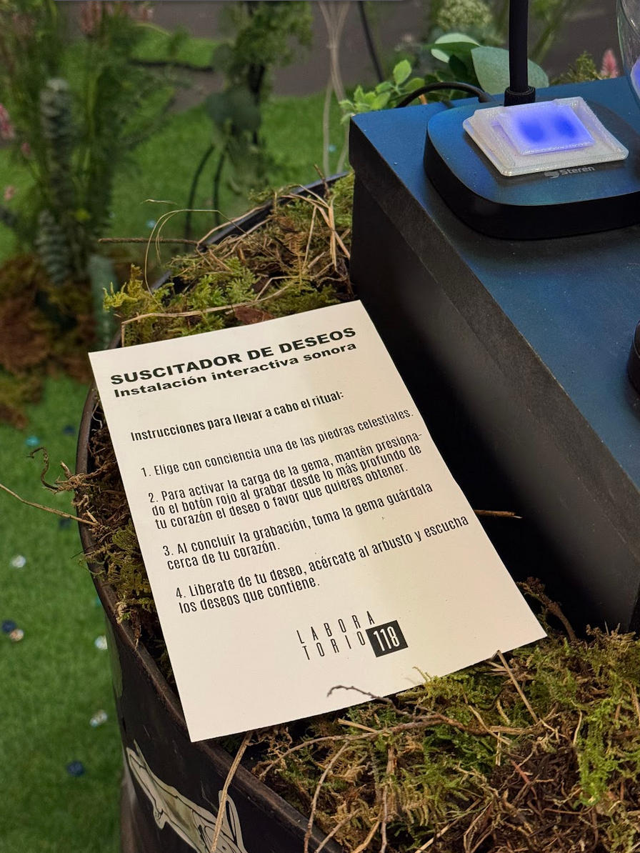 Sucitador de Deseos es una instalación Interactiva realizada en colaboración con Laboratorio 118. Esta obra evoca las memoria de todas las personas que le cuentan un deseo y las representa de forma lumínica. La parte tecnológica corre a cargo de Escalpelo Studio, la parte de arte, producción, concepto y montaje está a cargo de Laboratorio 118.